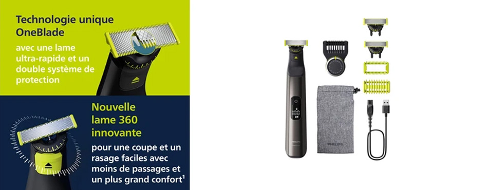 Découvrez l'outil tout-en-un ultime pour votre style : le Philips OneBlade Pro 360 Visage + Corps ! Oubliez la multiplication des appareils. Le OneBlade Pro taille, stylise et rase toutes les longueurs de poils, sur le visage comme sur le corps, sans jamais irriter la peau. Sa lame 360 révolutionnaire pivote et s'adapte à chaque contour pour une efficacité et un confort inégalés. Le sabot de précision vous offre 20 hauteurs de coupe (de 0,4 à 10 mm) pour un contrôle absolu de votre barbe. 100% étanche, utilisez-le à sec ou sous la douche. Son autonomie record de 120 minutes et son affichage LED en font le partenaire idéal au quotidien comme en voyage. C'est l'outil de précision dont vous ne pourrez plus vous passer.