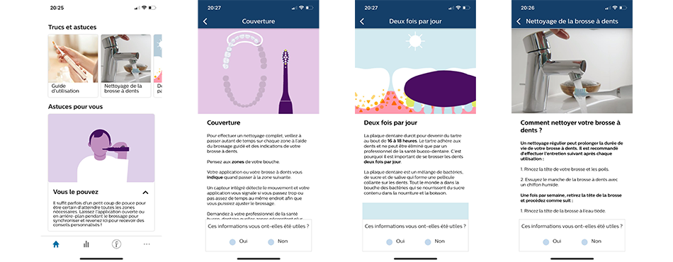 Le suivi proposé par l'application est un vrai plus car il vous donne des informations précises sur ce rituel incontournable pour la bonne santé de vos dents. De plus, pour les plus compétitifs, il vous permet également de vous motiver à rester "dans le vert" et d'obtenir les meilleures notations possibles.