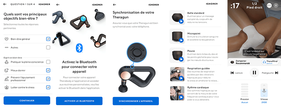 La marque propose une application qui vous accompagne et vous guide dans l’utilisation de votre pistolet masseur. Et le moins qu’on puisse dire c’est qu’elle est IN-DIS-PEN-SA-BLE ! En effet, une fois votre pistolet Sense sélectionné, vous pouvez personnaliser votre expérience. Vous commencez par renseigner vos objectifs (être plus actif, améliorer vos performances, soulager les douleurs, bien-être général, etc.). Puis vous indiquez les éventuels problèmes que vous rencontrez (douleur à la cheville, à la hanche, au coude, etc.), votre genre (homme / femme / non binaire) et vous voilà prêt à utiliser le Sense.