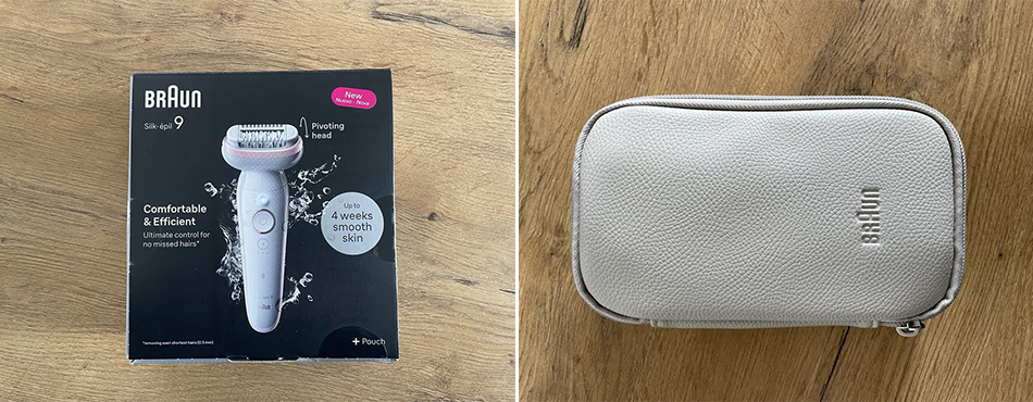 L’épilateur Silk Epil 9 est présenté dans un carton plutôt simple d’apparence mais à l’ouverture de ce dernier, nous sommes agréablement surpris à la découverte de la jolie pochette de rangement. De couleur grise, elle bénéficie d’une matière d’assez bonne qualité et agréable au toucher. Comme promis, l’épilateur est vendu avec une brossette de nettoyage et son câble d’alimentation, tout ce qu’il y a de plus ordinaire.