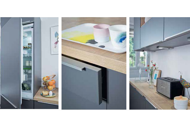 > Discrètes, les poignées de porte coloris inox disparaissent sous le plan de travail. Celles-ci sont profilées et directement fixées sur le chant de la porte pour une finition aussi harmonieuse qu’impeccable.
