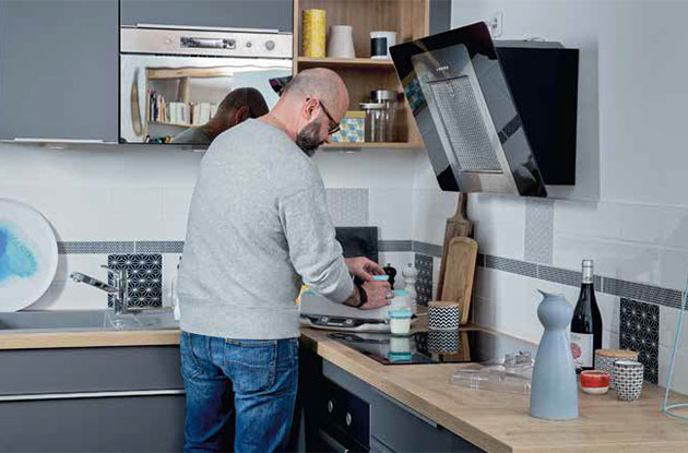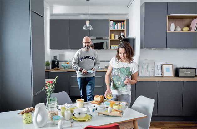 Le style de leur cuisine ? Chaleureux et frais à la fois. On sent l’inspiration scandinave (l’aspect bois clair du plan de travail et de la table, les façades laquées gris souris, la déco pastel…), le goût du fait maison (ustensiles et petit électroménager ne font pas de la figuration), un grand frigo rempli de produits frais et de saison… Et, ici et là, des niches et bibliothèques regorgeant de livres de recettes.