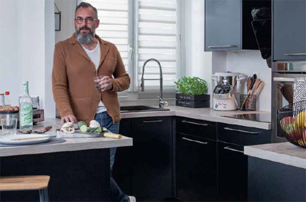 Le résultat donne un savant mélange de matériaux, un îlot généreux, des tabourets de bar vintage et des plantes aromatiques qui s’invitent ici et là. Si les façades laquées noir ultra mat affirment un vrai parti pris, le plan de travail en stratifié imitation bois et le parquet façon bois blanchi apportent la juste dose de charme.