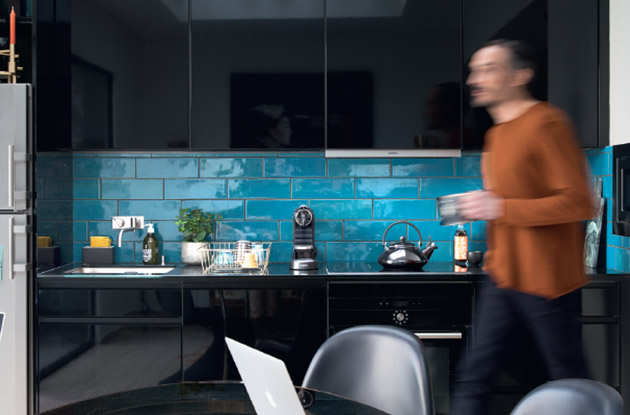La crédence en faïence bleu canard contraste graphiquement avec les façades laquées noires. Elle joue également sur les surfaces brillantes et les reflets.