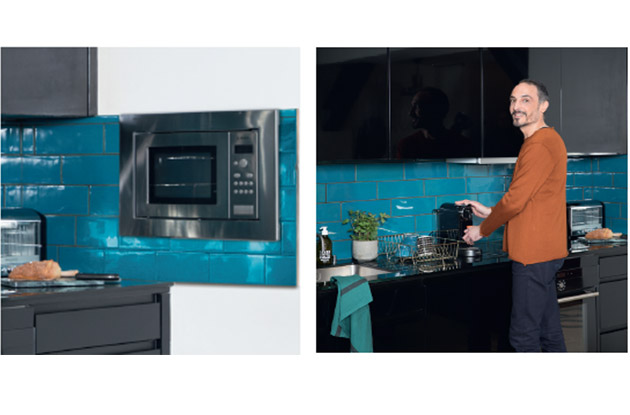 Pour optimiser l’espace, le four micro-ondes a été encastré dans le mur de retour de la cuisine, au niveau de la crédence.