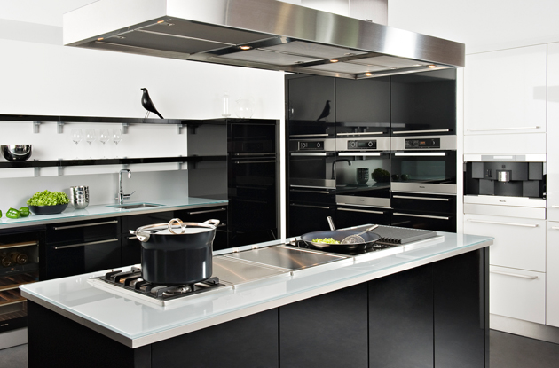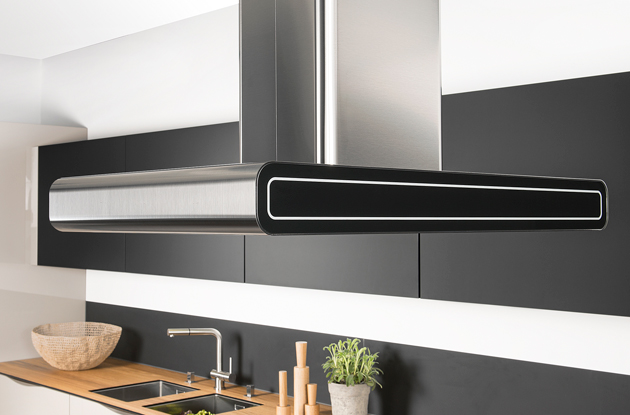 Le noir et blanc peut aussi venir de votre électroménager, à l’image de cette hotte noire très élégante. Vous remarquerez également en arrière-plan, le jeu de contraste entre la crédence noire et le mur blanc… Une autre idée d’aménagement très déco !