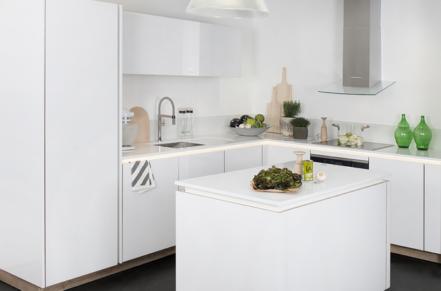 C’est très chic et moderne aussi, une cuisine toute blanche. Portes lisses et sans poignées, plan de travail, murs… Tout est blanc, ou presque ! Vous avez remarqué ? La touche de noir est au sol.
