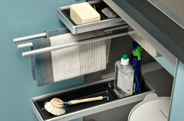 Brosse de nettoyage, produit vaisselle et autres nettoyants... On les entasse souvent sous l'évier et ils prennent plus de place que ce qu'on aimerait. Des coulissants spéciaux installés dans le placard sous l'évier permettent de les ranger en gagnant de la place et d'y accéder facilement. Vous pouvez même mettre des barres pour vos torchons pour un espace "vaisselle et nettoyage" complet !