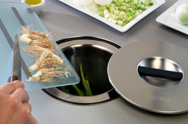 Mais que se cache-t-il sous ce couvercle posé sur le plan de travail ? Une poubelle encastrée ! Très pratique lorsque vous cuisinez, elle vous permet de débarrasser le plan de travail de vos détritus très facilement. Elle est idéale pour recueillir vos épluchures et autres restes organiques pour votre compost.