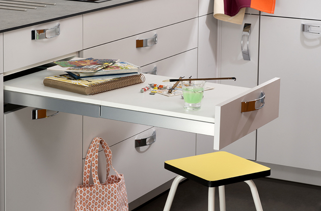 Dans les petites cuisines, on manque souvent cruellement d'espace pour les dessertes et plans de travail. L'aménagement malin, et original, c'est le tiroir qui n'en est pas un. Lorsqu'on le tire, une tablette coulissante apparait. Elle peut servir de table d'appoint, de plan de travail supplémentaire et disparait aussitôt lorsque vous n'en avez plus besoin, sans encombrer l'espace.