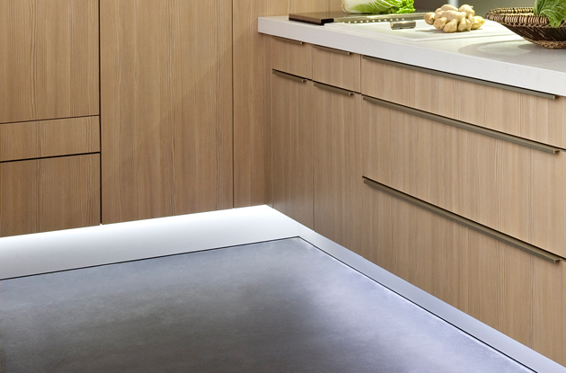 La lumière s'invite là où on ne l'aurait pas imaginée, du plafond, nous l'avons vu, jusque... au sol ! Dans une cuisine avec des plinthes en retrait, celles-ci peuvent être lumineuses. Avant tout esthétique, cet éclairage vient mettre en valeur toute votre pièce et lui confère un effet aérien.