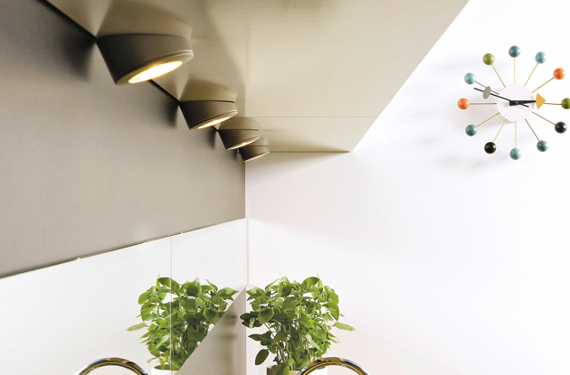 Sous les meubles hauts, vous pouvez également positionner des spots. Plus visibles, ils deviennent un élément déco à part entière dans votre cuisine. Leur éclairage directionnel permet de mettre en lumière des points stratégiques : le plan de travail, la zone de cuisson.