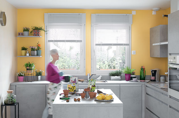 Le plan de travail stratifié reprend les façades gris clair effet béton. Associé aux autres éléments, il crée une unité de tons et de matières en accord avec les murs jaune soleil.