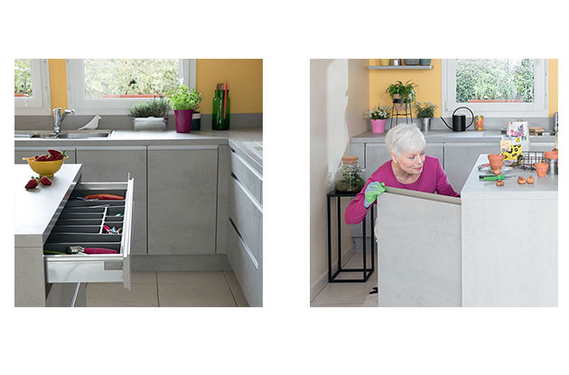 Monique a réservé une partie d’un placard de l’îlot central au matériel et au petit outillage de jardin. Ils sont ainsi à portée de main de cette retraitée active et passionnée.