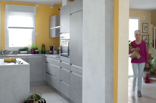 Cette cuisine joue la tendance minérale avec légèreté. Les murs jaune vif s’accordent avec le gris clair des façades texturées effet béton.