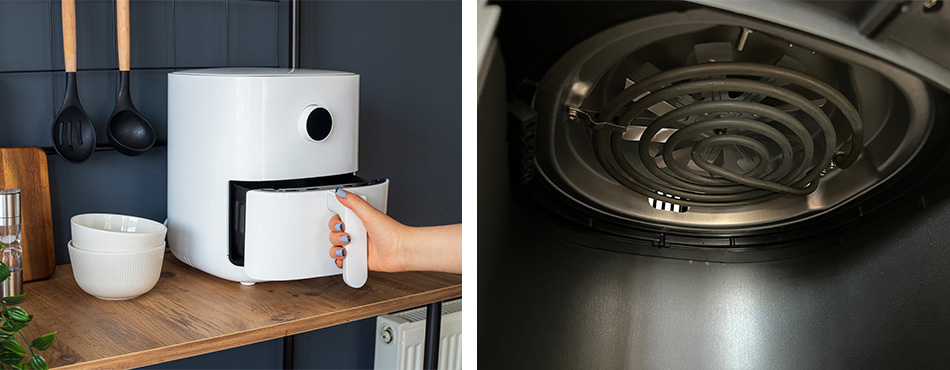 Afin que votre appareil reste performant au fil des cuissons, pensez à nettoyer l'intérieur du air fryer, c'est là que se trouve la résistance chauffante. Commencez par enlever les miettes en tapotant et en essuyant avec un chiffon doux et un peu de liquide vaisselle. Utilisez une brosse à poils souples pour enlever les résidus résistants, en particulier les coins du airfryer qui sont plus difficiles à nettoyer. Pour ces zones, vous pouvez utiliser des goupillons flexibles ou des cure-dent/brochettes en bois pour enlever les saletés. Retournez l'appareil pour accéder à l'élément chauffant afin de le nettoyer avec une éponge ou une brosse. Évitez d'utiliser trop de produits sur cette partie, car cela risque de laisser des odeurs.