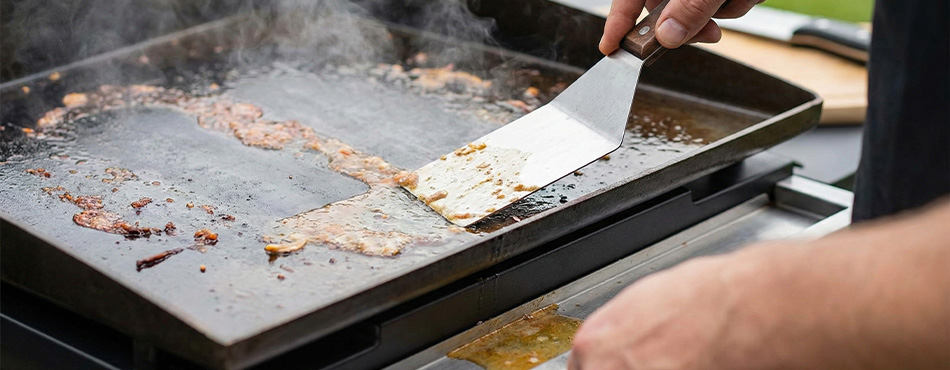 L'idéal est de procéder à chaud, juste après la cuisson. Avant que votre appareil ne refroidisse, versez un peu d'eau sur la plaque : le choc thermique aide à décoller les sucs. Grattez ensuite les résidus vers le bac à graisse avec votre spatule en inox. Ne craignez pas de gratter avec insistance, la plaque (surtout si elle est émaillée) est conçue pour résister.