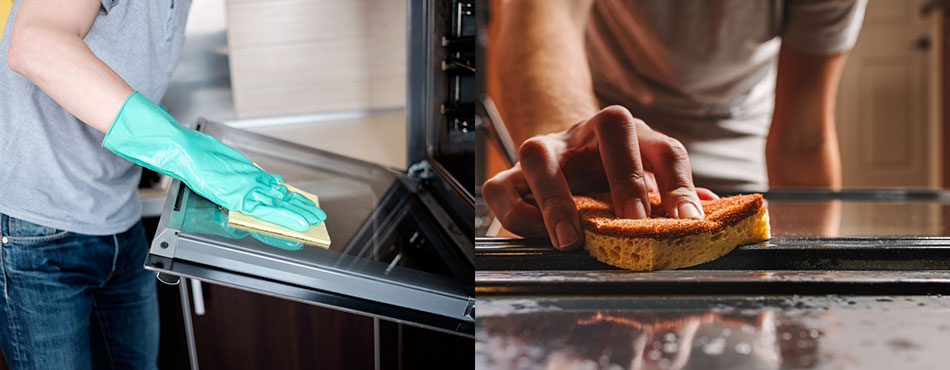 On dépose une quantité prédéfinie d’eau dans la sole du four et on lance le nettoyage par hydrolyse. L’eau est chauffée et transformée en vapeur, laquelle vient ramollir et décomposer les graisses et dépôts. Il suffit alors de les retirer avec une éponge.
