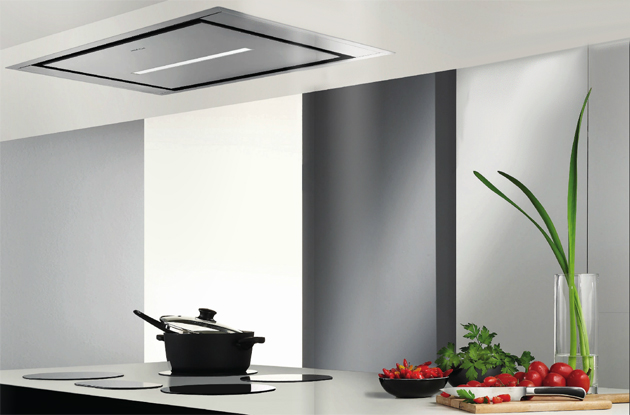 Ce type de hotte s'intègre discrètement dans un faux-plafond ou une structure décorative maçonnée, tout en conservant un champ de vision dégagé. Parfois, une télécommande permet de l’actionner. Sur le même principe, le groupe filtrant se fait très discret en étant placé sous les meubles décoratifs qui surplomblent la table de cuisson.