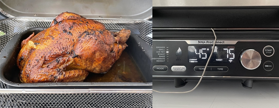 Suite à cela, j'ai pu essayer les autres modes de cuisson. Si les modes Cuire au four et Air Fry sont vraiment efficaces (ajoutez un filet d'huile sur vos frites pour un résultat vraiment croustillant !), c'est le Fumoir qui a vraiment retenu mon attention ! J'ai essayé de cuire un poulet entier en suivant les recommandations de l'application (mode Fumoir, 1h30 à 140°C avec le Woodfire activé). Le résultat est, sans exagérer, exceptionnel : le goût fumé était vraiment très présent, il ressortait bien en bouche comme à l'odeur. De plus, la viande était tendre et juteuse grâce à la cuisson lente. Un sans faute ! En termes de place, j'ai mis le poulet dans un plat pour pouvoir l'arroser, mais il est tout à fait possible de le poser directement sur la grille. Cela laissera même assez de place pour en mettre deux, ce qui est idéal pour les grandes tablées.