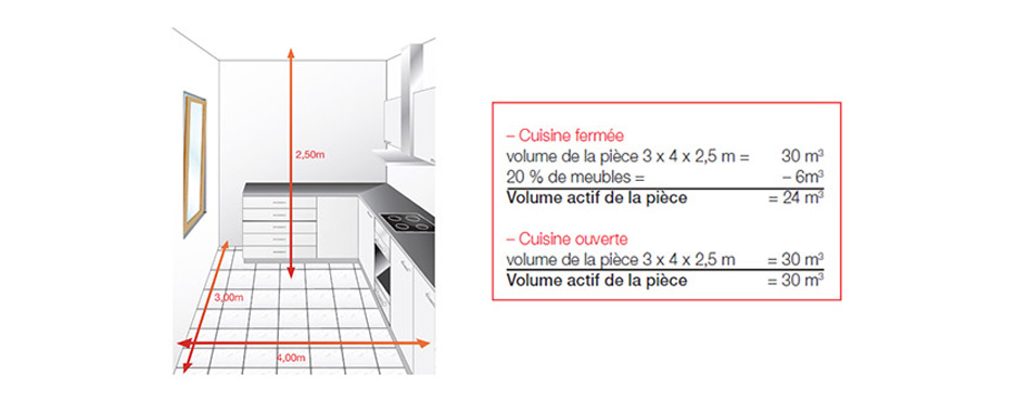 En cas de cuisine ouverte, il convient d'utiliser la surface de la cuisine comme base de calcul :