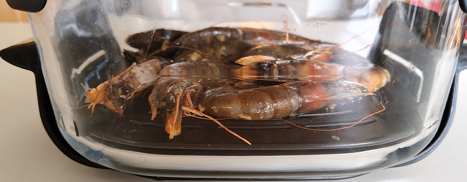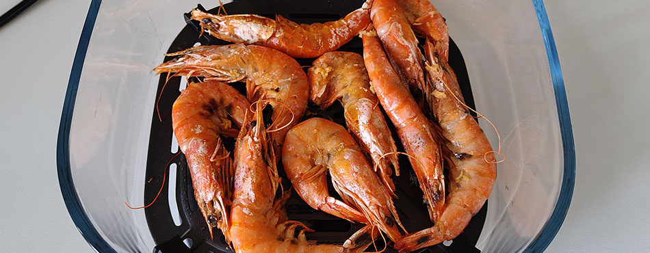 Après avoir laissé le tout macérer quelques dizaines de minutes, j’ai déposé le tout dans le grand bol, choisi le mode air fryer et lancé la cuisson pour 7 minutes. Et je n’ai pas tardé à m’apercevoir que le Ninja Crispi est très, très rapide ! Au bout de 5 minutes seulement mes crevettes étaient magnifiquement dorées, bien colorées et, je vous le garantis, absolument délicieuses !