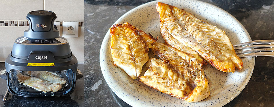 Ne reculant devant rien - oui, je suis comme ça ! - je me suis ensuite lancé dans la préparation de 2 filets de bar. Là encore, la cuisson fut très rapide et le résultat au-delà de mes attentes, avec une belle couleur dorée pour le filet de poisson, le tout en moins de 14 minutes et avec juste un filet d’huile d’olive, un peu de sel, du jus de citron vert, du poivre et de l’ail en poudre ! Accompagnés de haricots vert, ce fut un vrai délice !