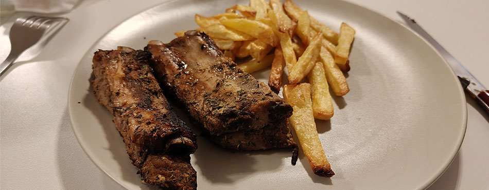Les travers de porc sortent magnifiquement dorés, parfaitement cuits et très tendres à l'intérieur, un régal, que j'ai accompagné de frites également cuites avec l'air fryer Toshiba. Notons que pour les frites, le programme automatique correspond selon moi à des portions réduites (1 à 2 personnes). Pour obtenir cette belle couleur et du craquant avec des frites faites maison et prévues pour 3 bons appétits, j'ai dû allégrement doubler le temps de cuisson. En effet, même en retournant les frites à mi cuisson, il restait des frites insuffisamment cuites ou pas assez dorées. Bien entendu, cela va beaucoup plus vite avec des frites surgelées, lesquelles sont précuites.