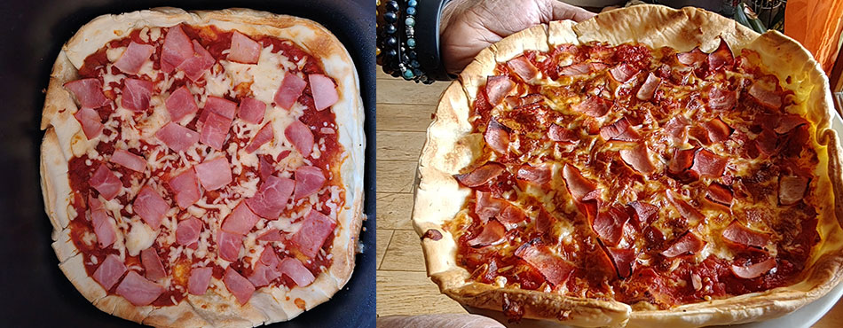 Pour terminer ce test, je suis parti d'une base de recette de pizza (récupérée sur le livret de recette) pour préparer une pizza tout simple. Gros avantages de la cuisson d'une pizza au air fryer, en comparaison d'une cuisson au four, ça va plus vite et ça consomme moins d'énergie. Sans compter que nettoyer le tiroir du Toshiba 7,4L est plus simple selon moi que nettoyer qu'une plaque à pizza.