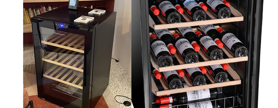Amateurs de vin, la cave de service Thomson MILLESIME49 est faite pour vous ! Avec ses 3 clayettes en bois, elle permet de stocker jusqu'à 48 bouteilles à la température désirée, de la suivre et la régler directement sur l'écran électronique sur le haut de la porte.