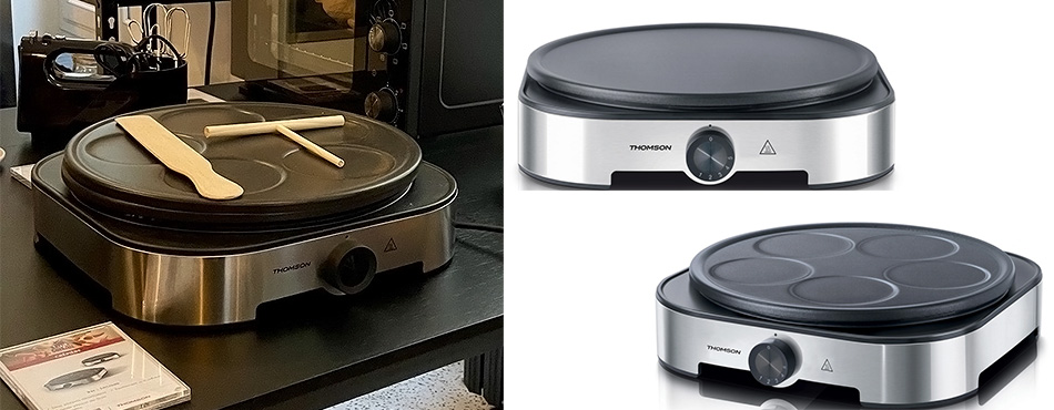 À la Chandeleur ou à Mardi Gras, salées ou sucrées, les crêpes sont un incontournable des déjeuners ! Pour vous aider à régaler tout le monde, la crêpière électrique Thomson THC1500 offre au choix une large plaque de 37 cm, pour contenter les plus gourmands, ou un support pour cuire 5 mini-crêpes simultanément, pour les plus pressés ou les grandes tablées. Il est possible de régler la température de la plaque grâce au thermostat rotatif à l'avant de la crêpière.