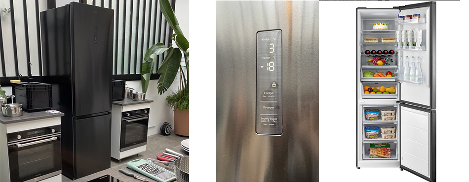 Avec l'écran électronique placé sur la porte, il est possible de choisir différents modes de refroidissement, comme les fonctions Super Cool et Super Freeze qui permettent d'abaisser rapidement la température du frigo, pour les retours de courses par exemple, ou encore le Mode Vacances, qui conservera les aliments au frais durant les périodes d'absence et passera en mode économie d'énergie.