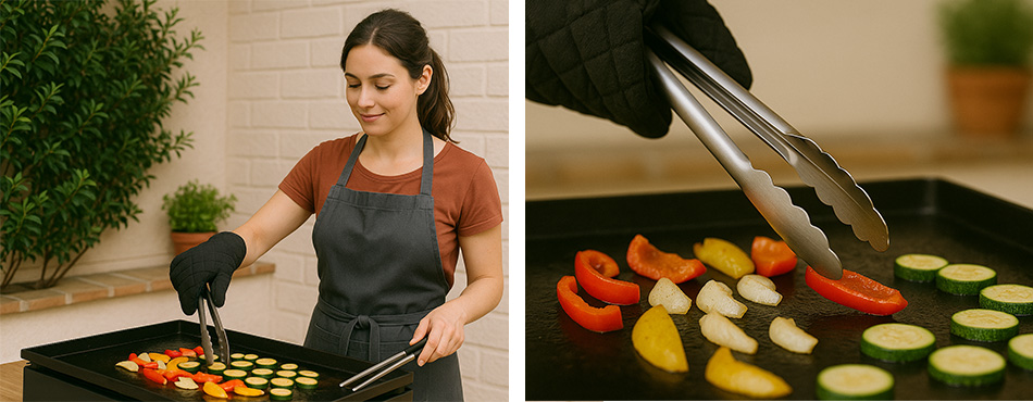 Tout comme le barbecue, les ustensiles pour cuisiner à la plancha ne sont pas à négliger. Pour éviter les petits accidents, comme les petites brûlures, équipez-vous d'un tablier de cuisine, d'un gant et d'une pince pour retourner les aliments en toute sécurité. Bien évidemment, le plastique est à proscrire si on ne veut pas qu'il fonde... et il est préférable de privilégier le bois ou l'acier inoxydable.