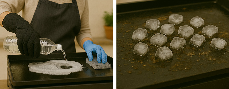 Si nous devions résumer, il ne faut en aucun cas utiliser des produits ménagers ! Si la plaque est encore tiède, des gaz toxiques peuvent alors s'évaporer, et ces produits abîment la plaque. Lorsque votre plaque est encore légèrement chaude, déposez des glaçons afin de décoller les sucs. Cela vous permet ensuite de racler ces derniers avec l'aide d'une spatule. Pour finir, le vinaigre blanc est tout indiqué pour nettoyer votre plancha. Naturel et décapant, il vous permettra de décrasser votre plaque de cuisson. À la fin de votre nettoyage, vous pouvez ajouter une noisette de savon sur une petite éponge, rincer et bien sécher avant de la ranger.