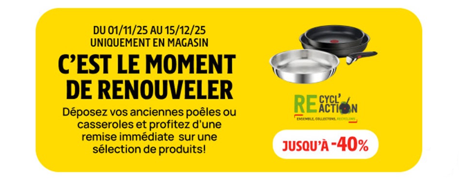 Du 1er novembre au 15 décembre, nous vous invitons à rapporter en magasin vos anciennes poêles, sauteuses, casseroles ou faitouts. Peu importe leur état, leur marque ou leur matière, nous les acceptons tous pour leur donner une nouvelle vie grâce à des filières de recyclage spécialisées. C'est un pas de plus vers une consommation plus responsable et un geste concret pour réduire les déchets.