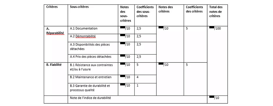 | Indice de réparabilité + Critère de fiabilité = Indice de durabilité |