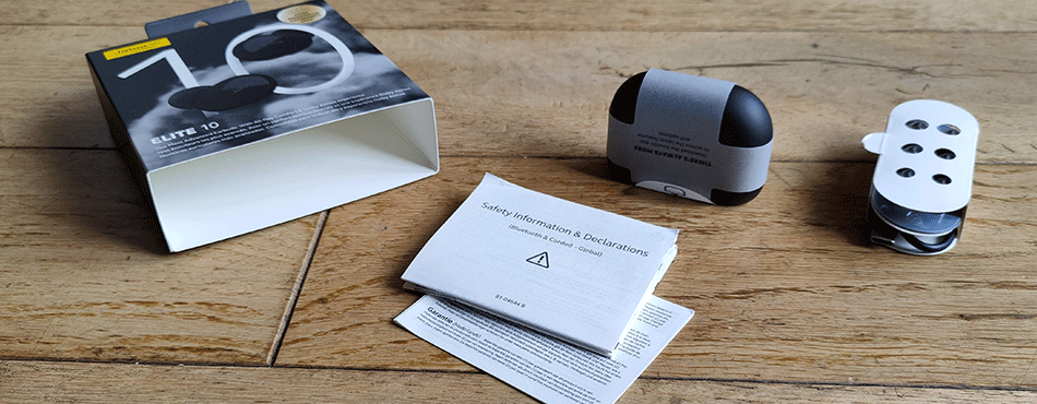 Les Jabra Elite 10 sont livrés dans une boite sobre et sans fioriture ; on y trouve un câble USB type C destiné à la charge (pas d’adaptateur secteur fourni cependant) ainsi que 3 paires d’embouts EarGel. Notons qu’une quatrième paire d’embouts est préinstallée sur les écouteurs. Pour finir, une très succincte notice d’utilisation est présente. Il vaut de toute façon mieux passer par l’installation de l’application Jabra Sound+, sur laquelle vous trouverez toutes les instructions de mise en route et de configuration.