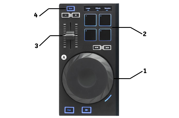 de pads (les quatre carrés noirs) pour utiliser les sample, les loop, les effets et sur certaines platines les points cue ;