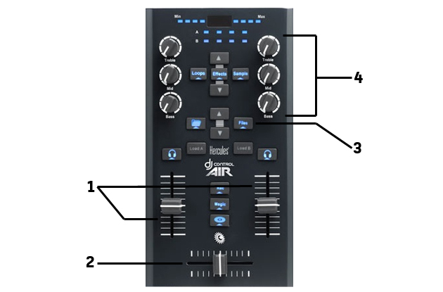 le cross-fader (glissière horizontale) qui permet de basculer sur la platine A ou la platine B, donc d'un morceau à l'autre ;