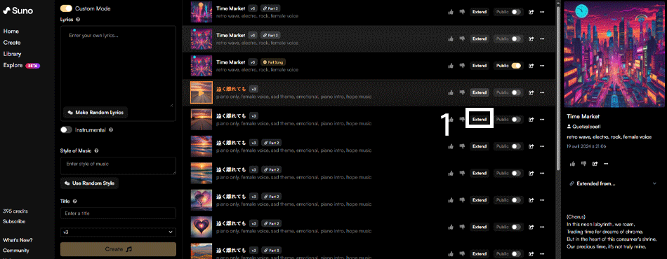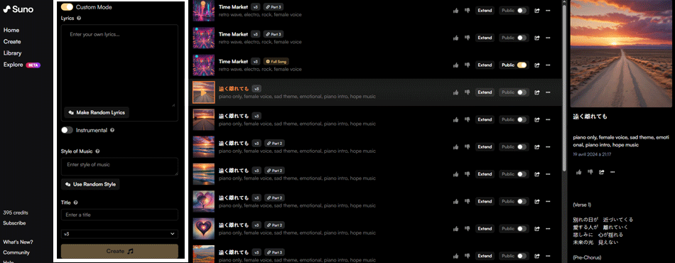 Si vous voulez créer une chanson entière d'environ 8 minutes ou plus, c'est faisable ! Vous allez diviser vos paroles en plusieurs parties. Il vous suffit donc de diviser vos couplets en plusieurs parties. Insérez la première partie dans la fenêtre de chat, renseignez le reste des informations de votre son, puis créez ladite musique. Une fois que vous avez choisi la proposition qui vous plaît le plus, cliquez sur le bouton "extend" visible avec toutes les options de votre musique. Vous allez donc effacer les paroles pour mettre les suivantes. Vous pouvez également choisir à partir de quand, dans la première partie, Suno doit commencer la deuxième. Cliquez ensuite sur "create", et Suno va créer la nouvelle partie ! Vous pouvez continuer ainsi pour une troisième, voire une quatrième partie. Une fois toutes vos parties créées, allez dans les options de la dernière partie, via les trois points tout à droite de la fenêtre, et cliquez sur "Get Whole Song". Suno va compiler toutes les parties et créer une seule musique.