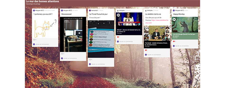 Vous partagez sur vos réseaux sociaux privés des vidéos drôles et photos mignonnes que vous vouliez absolument montrer à vos ami.e.s. Le mur collaboratif en ligne vous permet de partager du contenu avec vos collègues : une musique ou une vidéo pour être de bonne humeur, de l’actualité, la photo de votre espace de télétravail, ou encore un selfie avec votre chat couché sur le clavier.