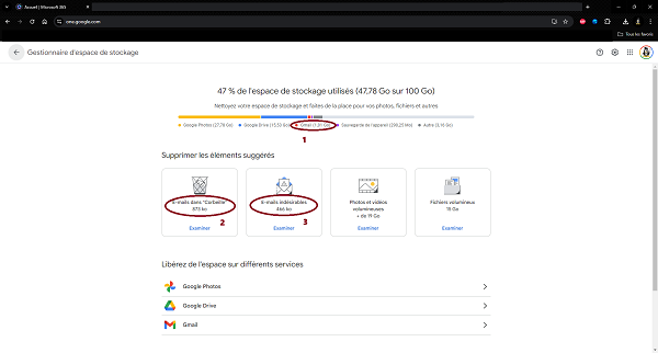 Dans mon exemple, on constate que Gmail n’occupe que 1,01Go (1) du stockage, que la corbeille et les spams n’occupent que quelques centaines de Ko. Le reste du stockage est utilisé par les photos, vidéos et fichiers volumineux.