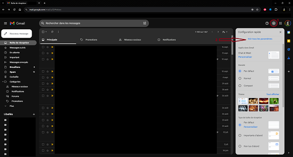Qui a dit qu'il fallait garder tous ces mails publicitaires ou newsletter ? Dans les paramètres de Gmail (1) , sélectionnez "voir tous les paramètres" .