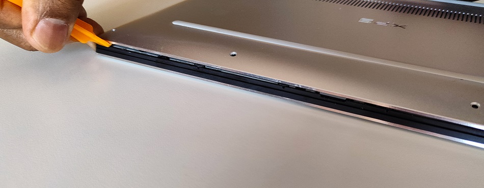 Une fois toutes les vis retirées et soigneusement mises de côté, vous pouvez ôter la coque arrière. Si un ustensile dédié était fourni avec vos pack de tournevis, n’hésitez pas à vous en servir, il permet d’entrouvrir tout le pourtour de l’ordinateur sans abimer les composants. Armé de cet outil, on déclipse le dos de l'ordinateur en le désolidarisant progressivement sur tout le pourtour et en prenant bien garde d'éviter de détériorer l'électronique. Vous pouvez utiliser un couteau en plastique pour faciliter l'ouverture, mais il vaut mieux éviter tout objet métallique (couteau, pince à épiler, etc.).