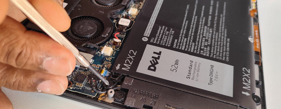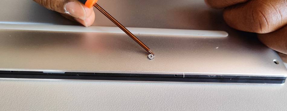 On commence par dévisser la face arrière de l’ordinateur. Attention, il faut absolument éviter de forcer, sous peine de « foirer » le pas de vis de manière irréversible. Dans le même ordre d’idée, il faut bien choisir la taille de tournevis, l’utilisation d’un tournevis trop petit risquant là encore d’abimer la vis. Si malgré toutes vos précautions cela arrive, je vous conseille de vous rapprocher d’un technicien informatique qui disposera de l’expertise et des outils pour résoudre le problème. Si vous tentez de le faire vous-même avec une perceuse et une mèche ultra fine comme on le voit sur certains tutos vidéo, vous risquez de toucher une pièce sensible.