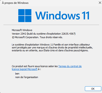 Dans mon cas, c'est un Windows 11, je ne suis donc pas concerné par la fin de support. Dans le cas où votre version est Windows 10 22H2, vous faites partie des machines qui seront impactées en octobre 2025. Attention, pour les utilisateurs de la version la plus ancienne de Windows 10 estampillée 21H2, l’arrêt de du support est intervenu en juin 2024, dans ce cas il y a urgence à intervenir, pour la sécurité de vos données.