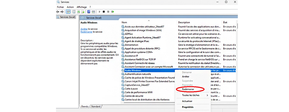 Vérifiez aussi la section "Générateur de points de terminaison du service Audio Windows" et redémarrez-le de la même manière.