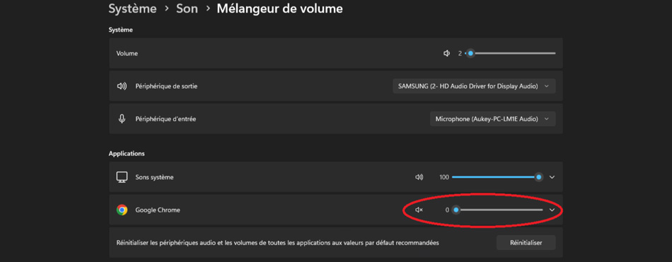 Pour résoudre le problème, faites un clic droit sur l'icône Son, puis Ouvrir le mélangeur de volume. Assurez-vous que le volume de l'application concernée n'est pas réglé au minimum, comme sur l’illustration ci-dessous. En cas de doute, faites une réinitialisation des périphériques audio