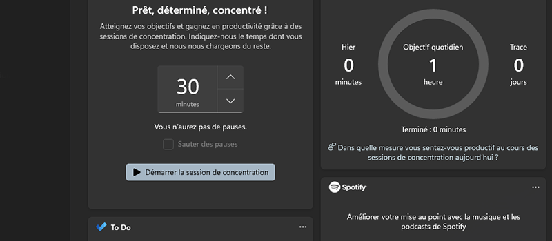 Envie d'améliorer votre productivité ? Concrètement, quand vous démarrez une session concentration, Windows active le mode "Ne pas déranger". Cela coupe les notifications, désactive les badges de la barre des taches et les notifications des applications. L’application Horloge propose de programmer une minuterie pour vous concentrer et faire des pauses.