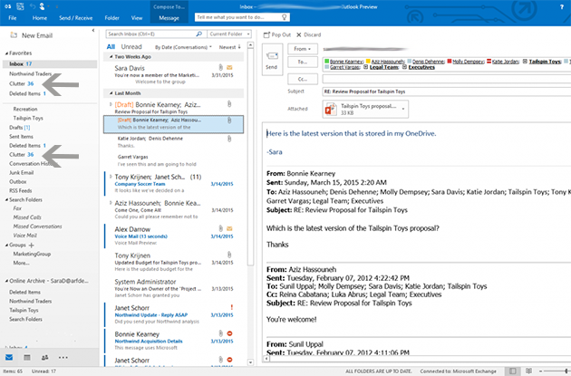 Trier ses mails peut se révéler un vrai casse-tête, que ce soit au travail ou chez soi. Alors Outlook 2016 vous aide avec la fonction "Pêle-mêle"* (Clutter en Anglais, voir ci-contre). Il analyse votre utilisation et vos habitudes de lecture, puis trie automatiquement après quelques jours vos mails non importants selon vos critères dans une boîte "pêle-mêle". Ainsi, votre boîte mail comporte uniquement vos courriers urgents, évitant toute perte de temps.